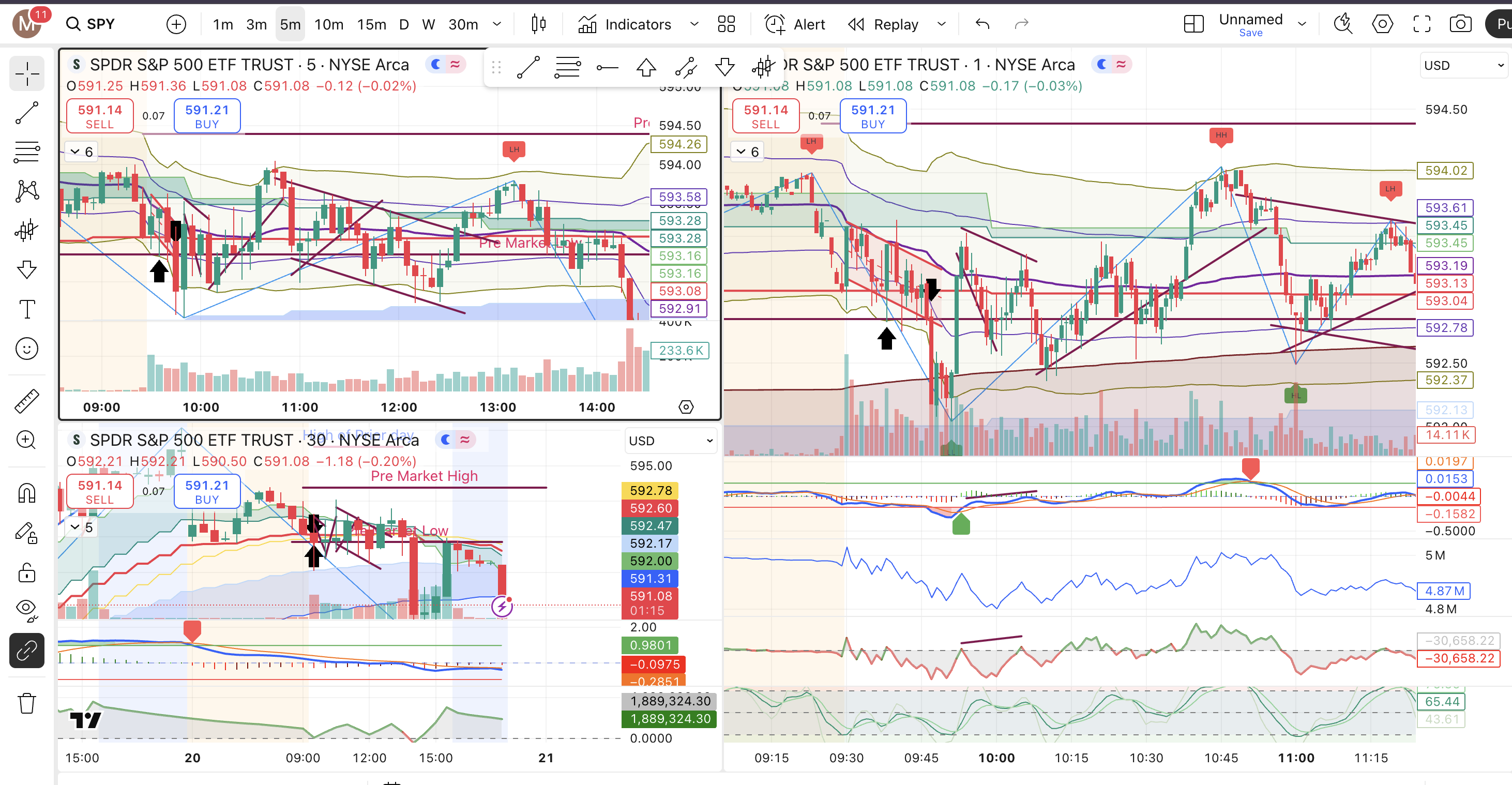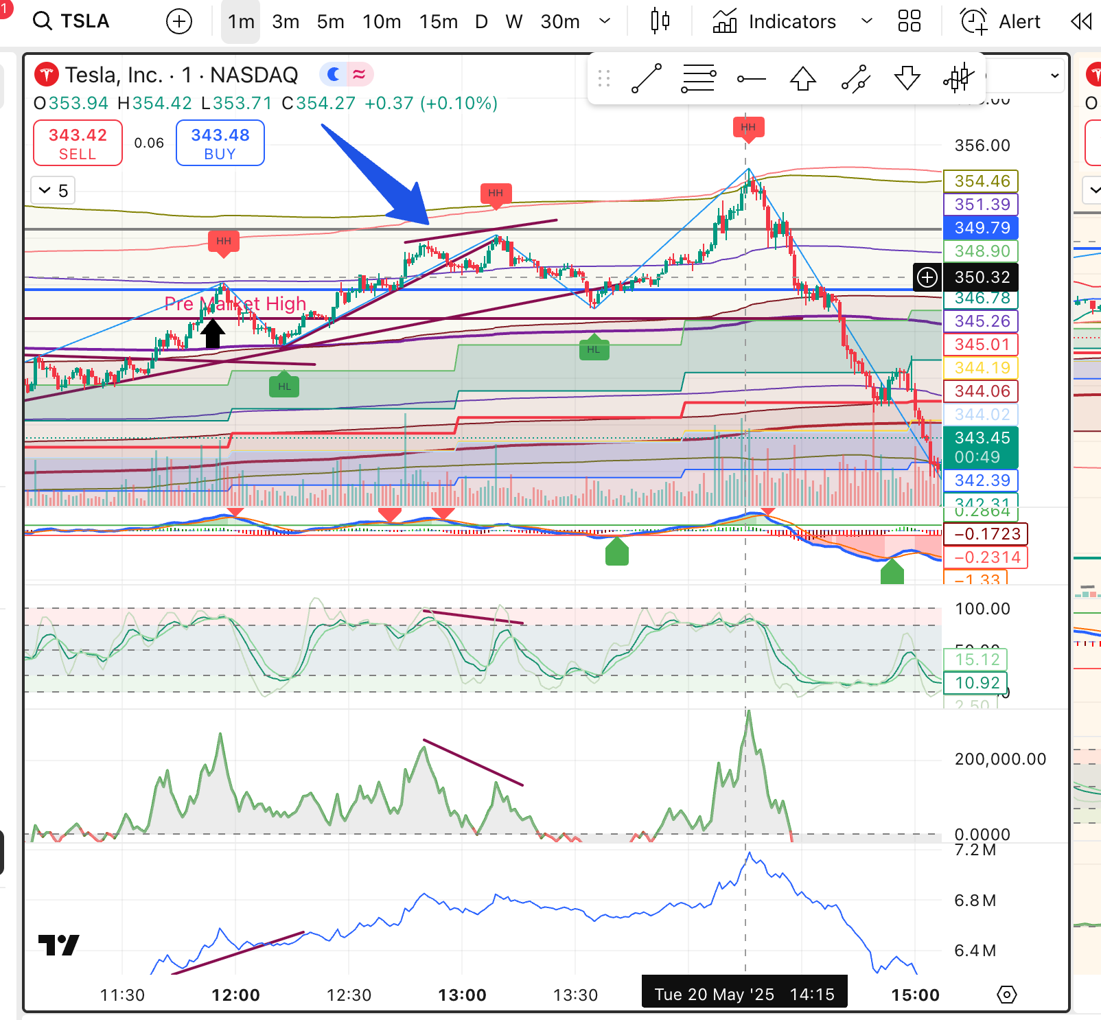 来看看今天拉子股票复盘。开盘显示来了一波拉升,可以看到昨天盘后以及今日盘前都是一个稳定上涨的趋势。灰色的线是前天高点,可以看到五分钟图其实是没站稳并且在这里反弹的。这里做的比较好的是发现拉子拉这么高之后没有冲入场,显然此时离云太远还进去是不合理的。马上就可以看到有一波下跌回到mtf云的下沿 然后在mtf云的上沿震荡,这里没有明显趋势也不应该入场!